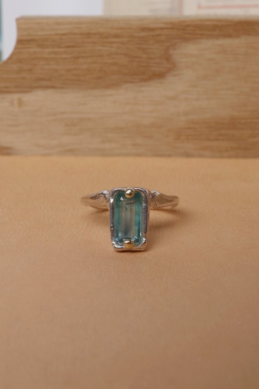 静かに降る雨の様子からインスピレーションを受けて製作したカイヤナイトを使用したリングです。