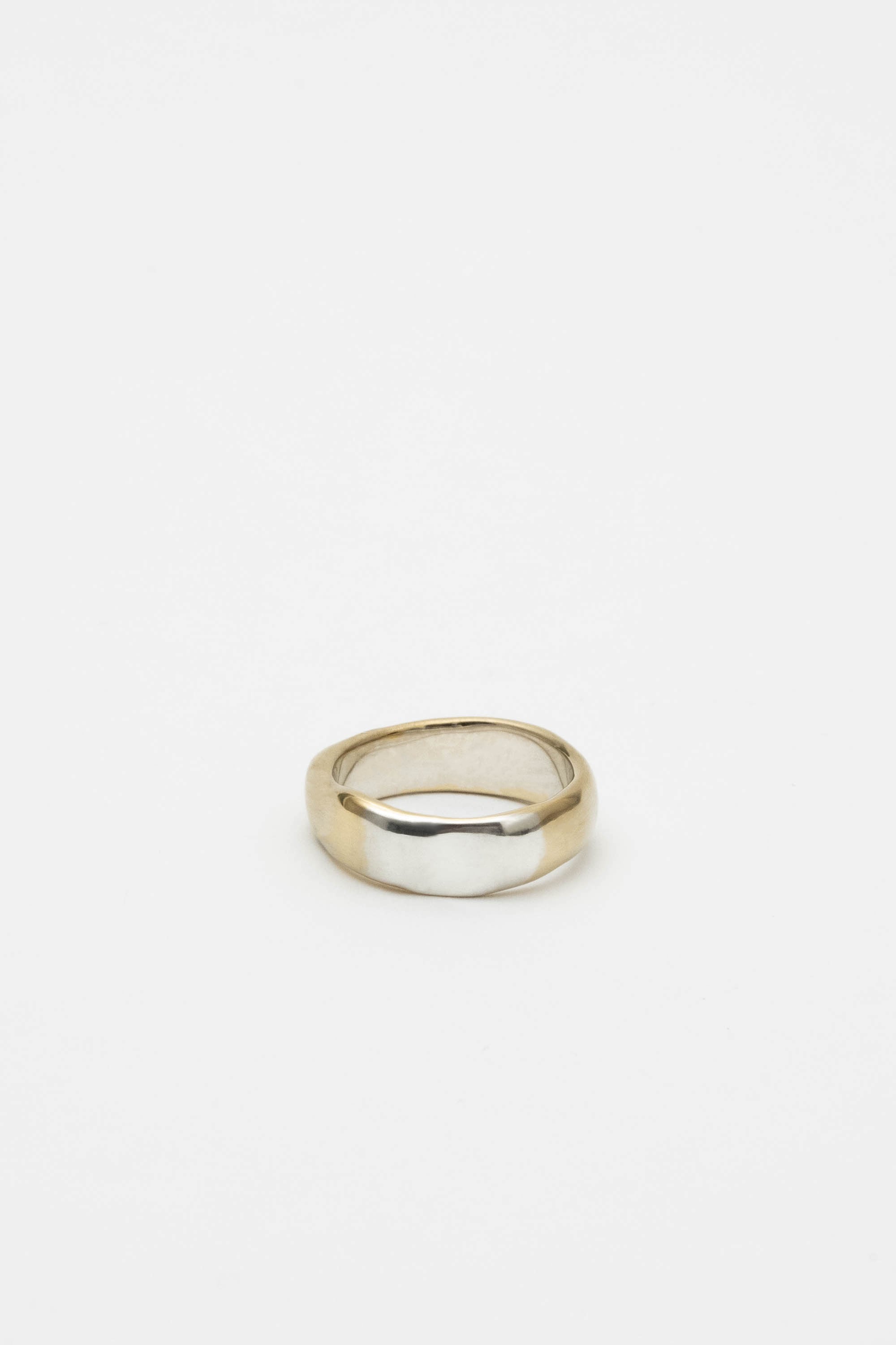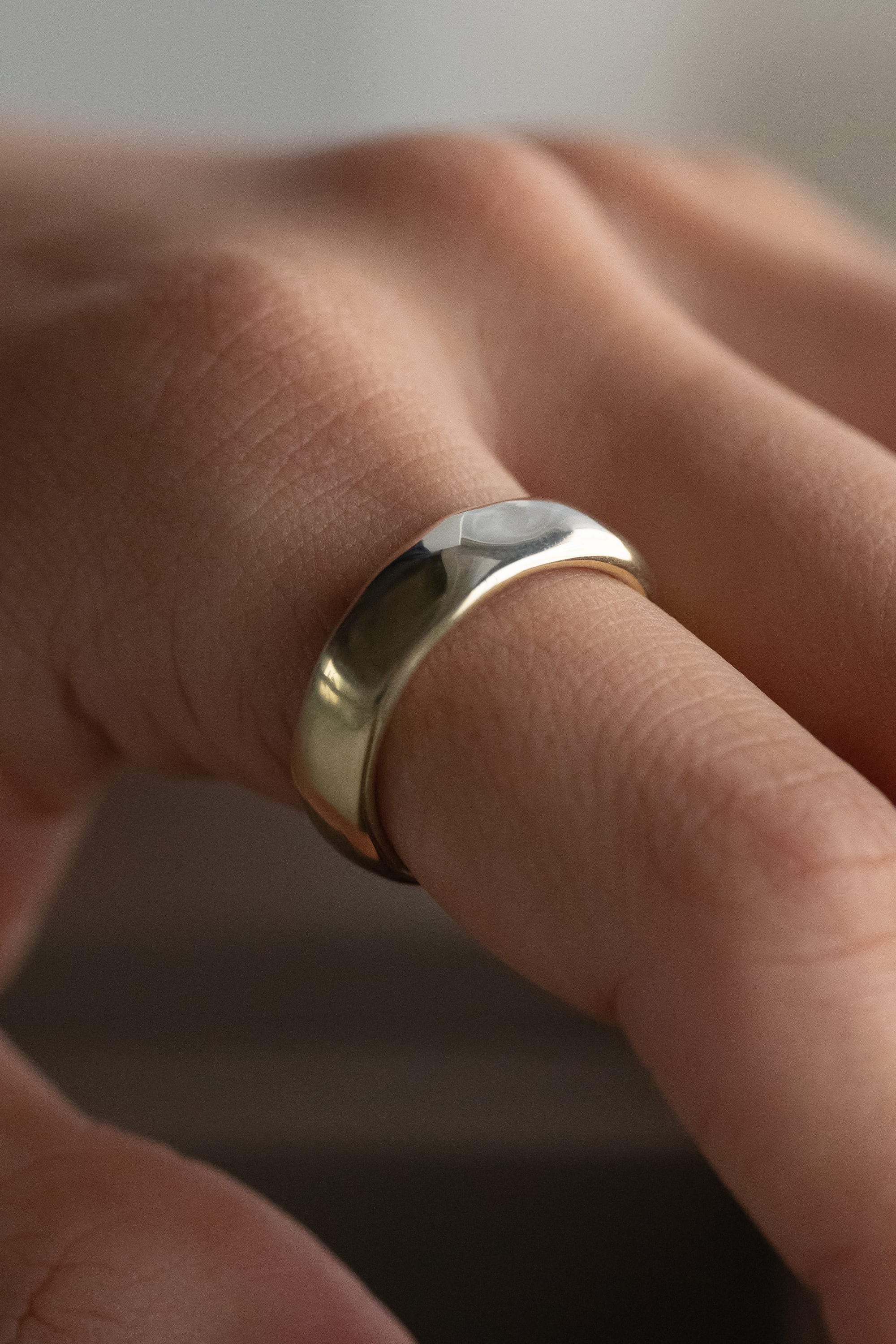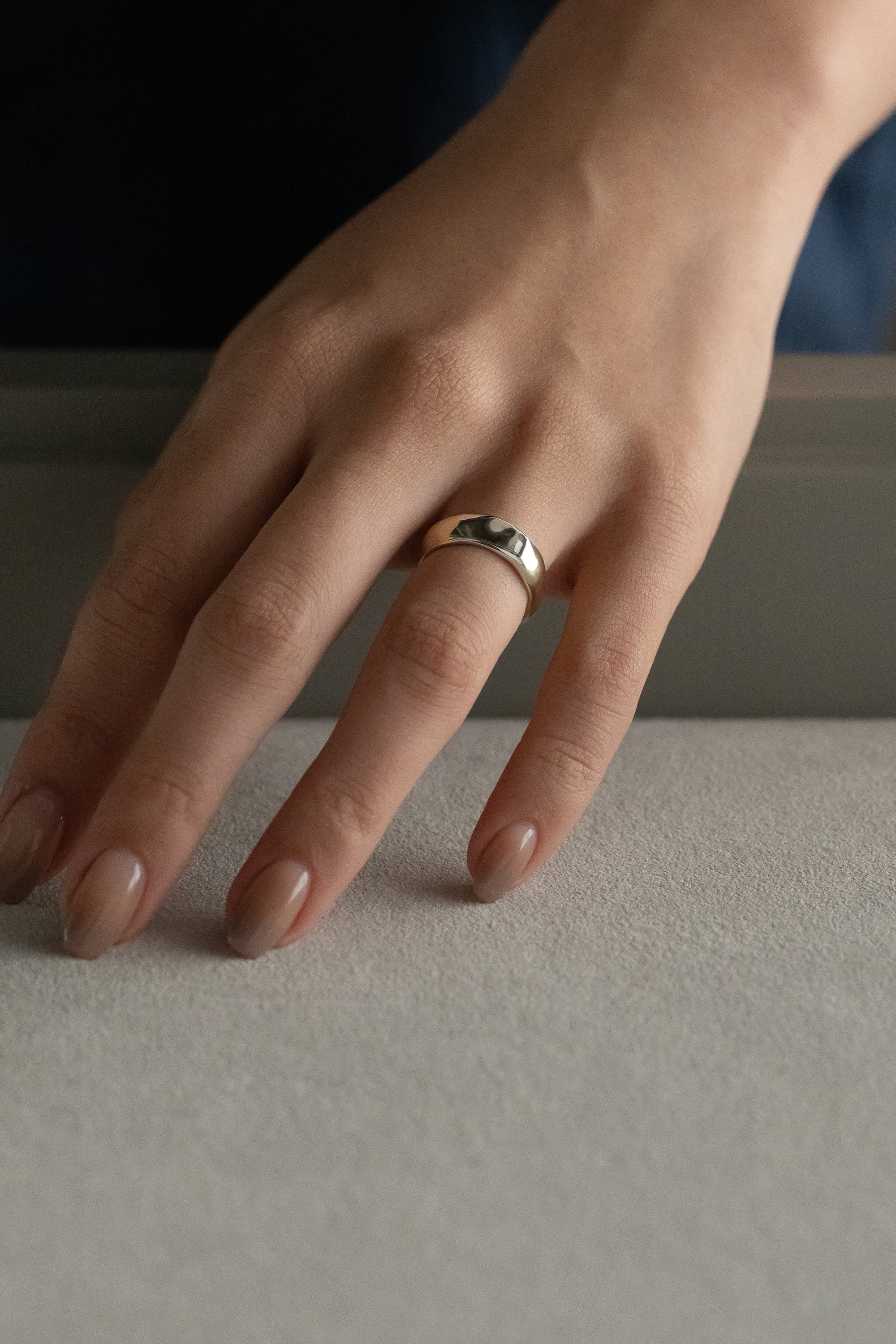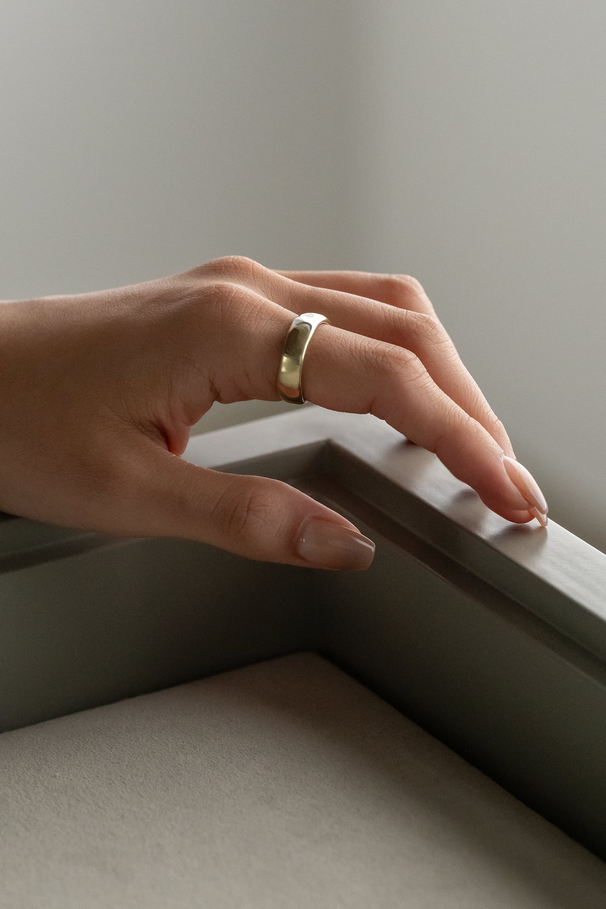 トップの凹みだけ鏡面仕上げにしており、リング部分はハンドマット仕上げにして質感や輝きを楽しむことができるデザインです。