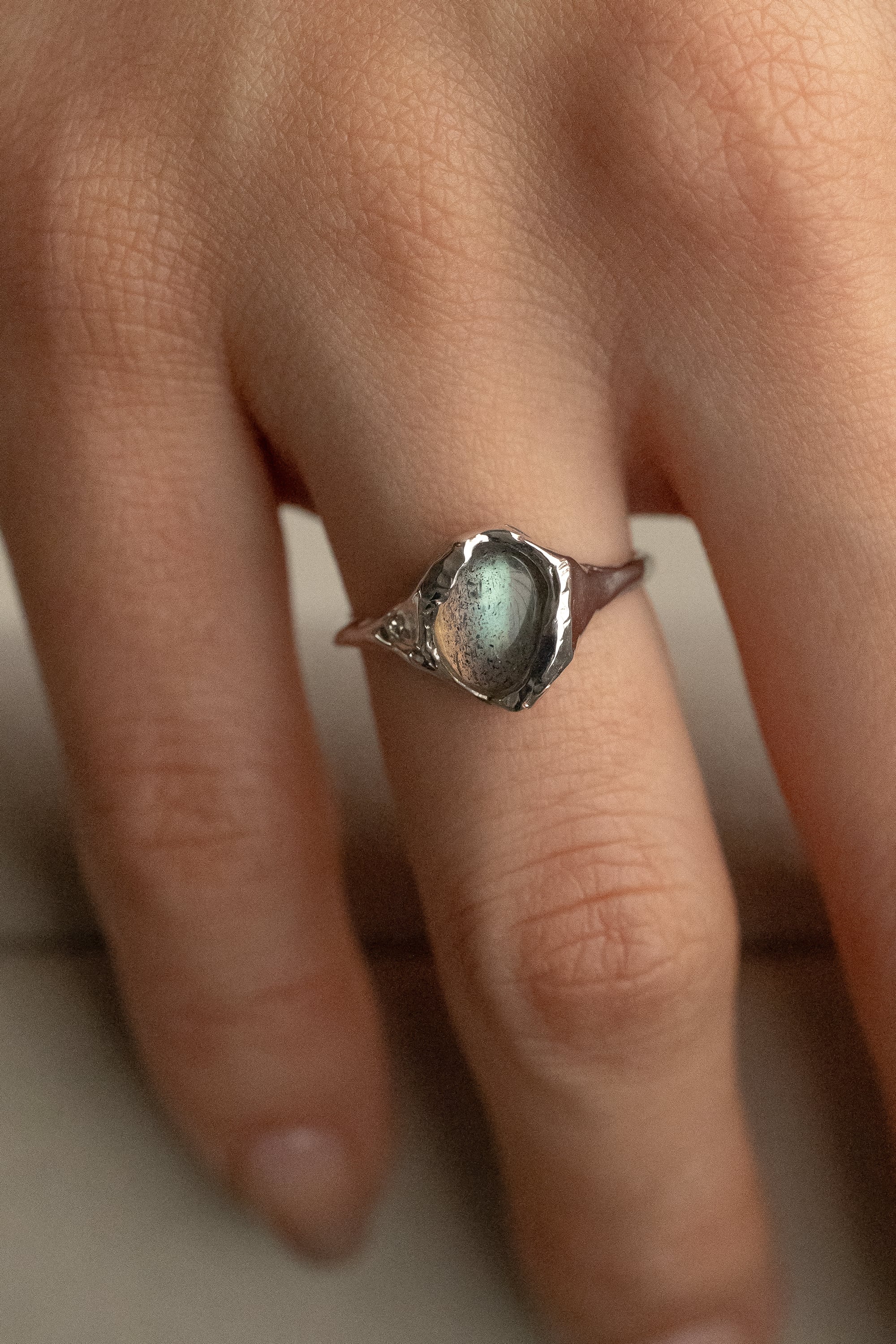谷に川が流れ、水がたまる様子をラブラドライトで表現しました。