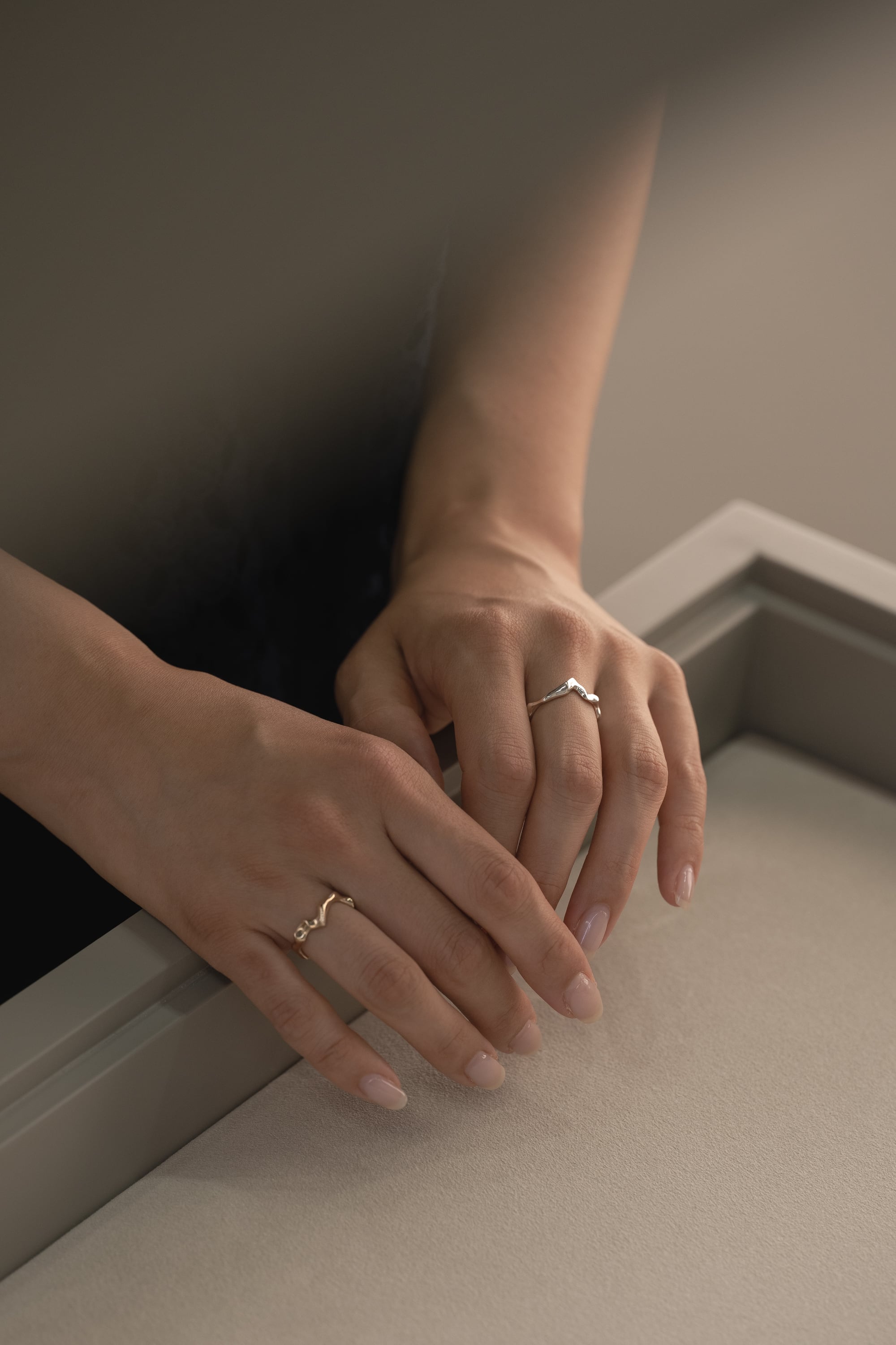 厚みも存在感もありますが、指なじみがよく、細いリングとも相性が良いです。