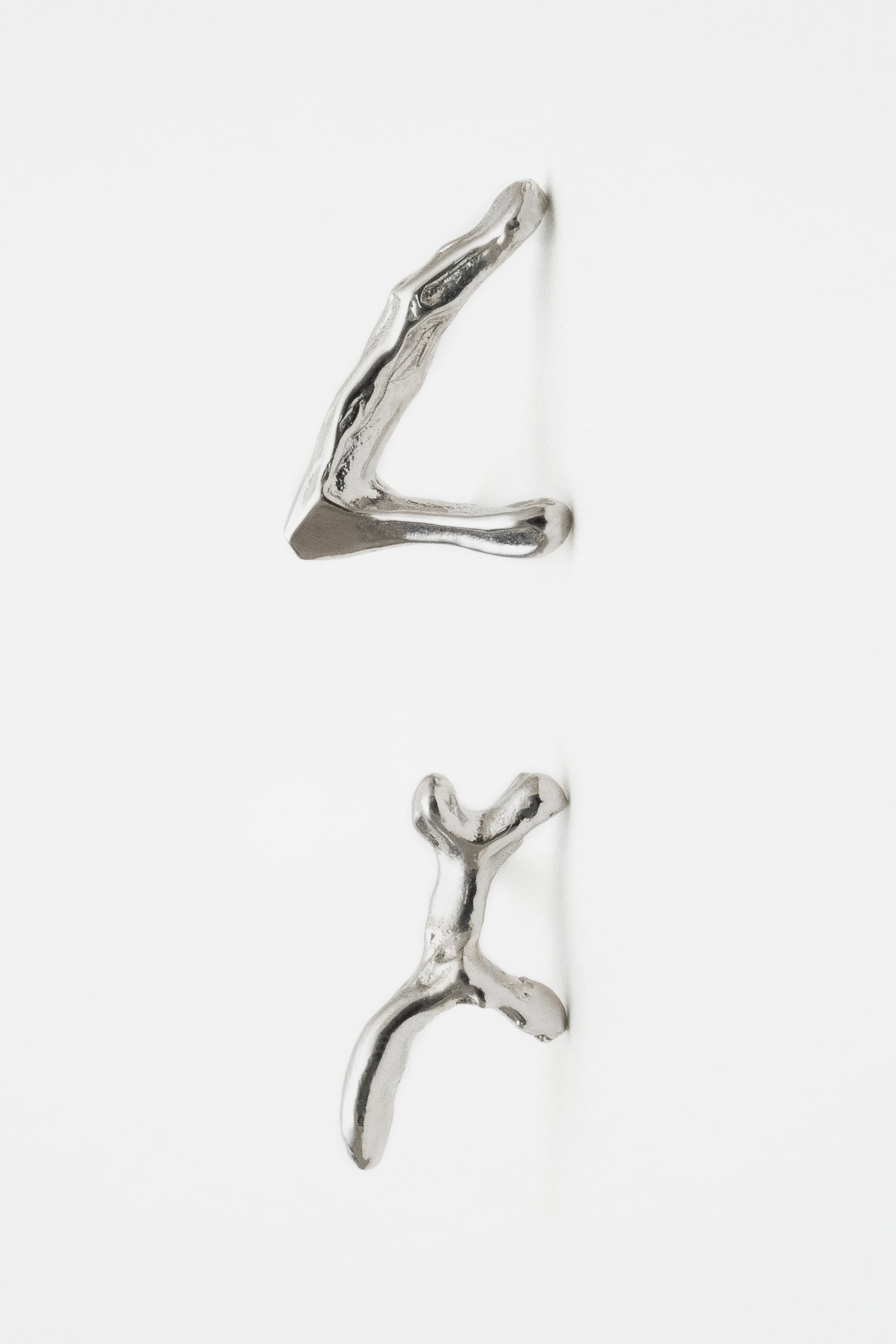 染色体のかたちや動きをイメージソースに製作したピアスは小枝や珊瑚の形、石目や木目の模様にも見えます。