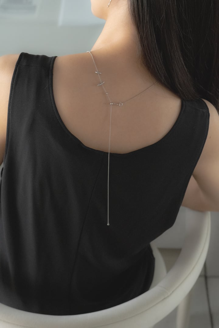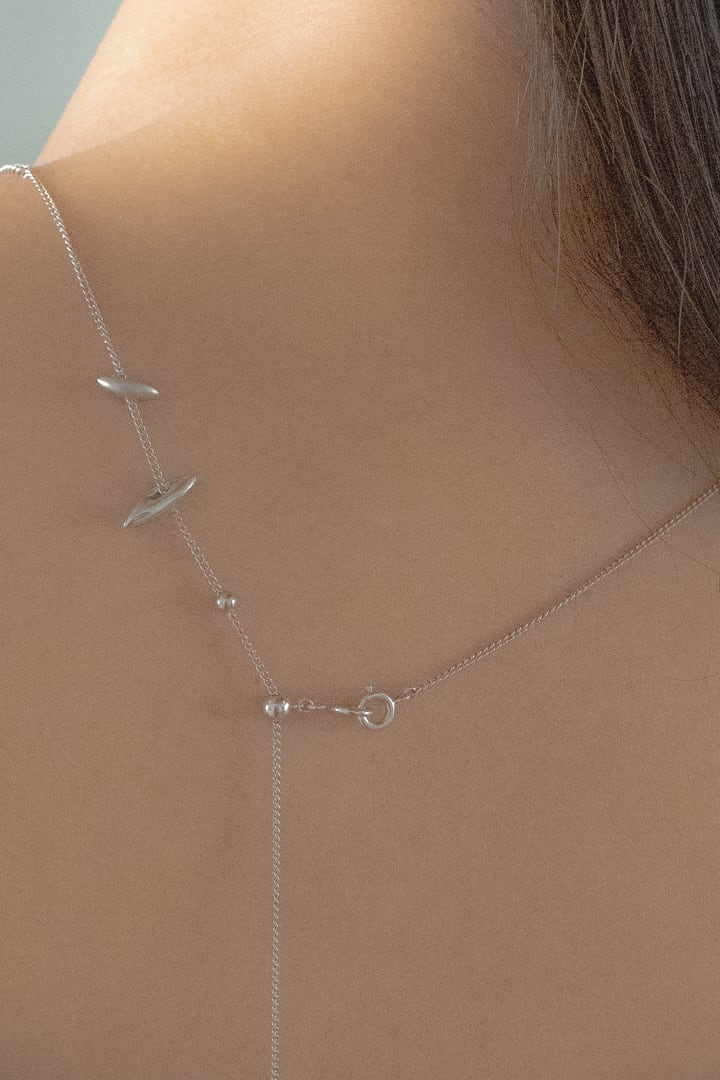 シリコンボールやビーズパーツは動くようになっているため、お洋服と合わせる際にネックの位置と合わせて長さの調整ができます。