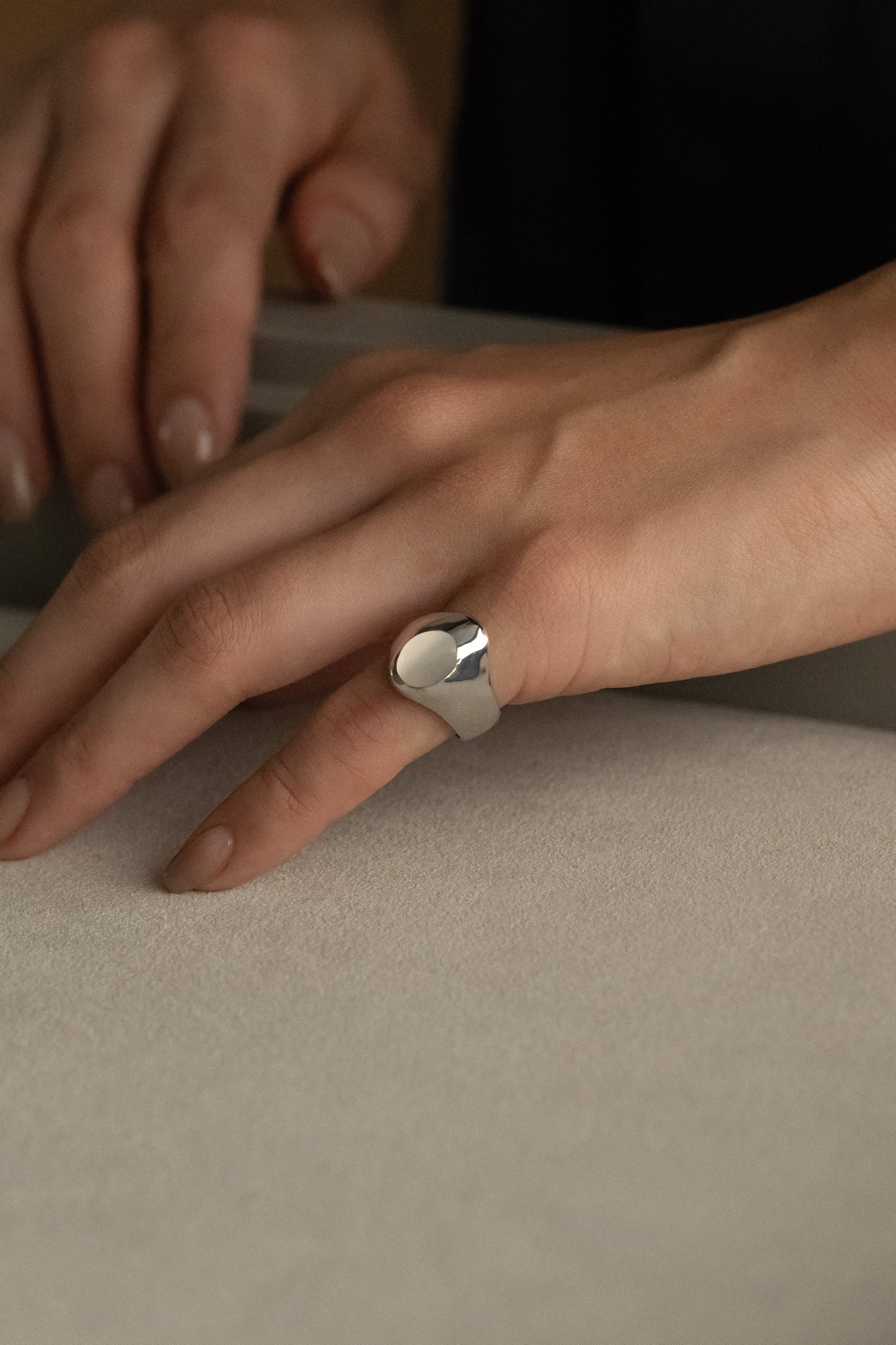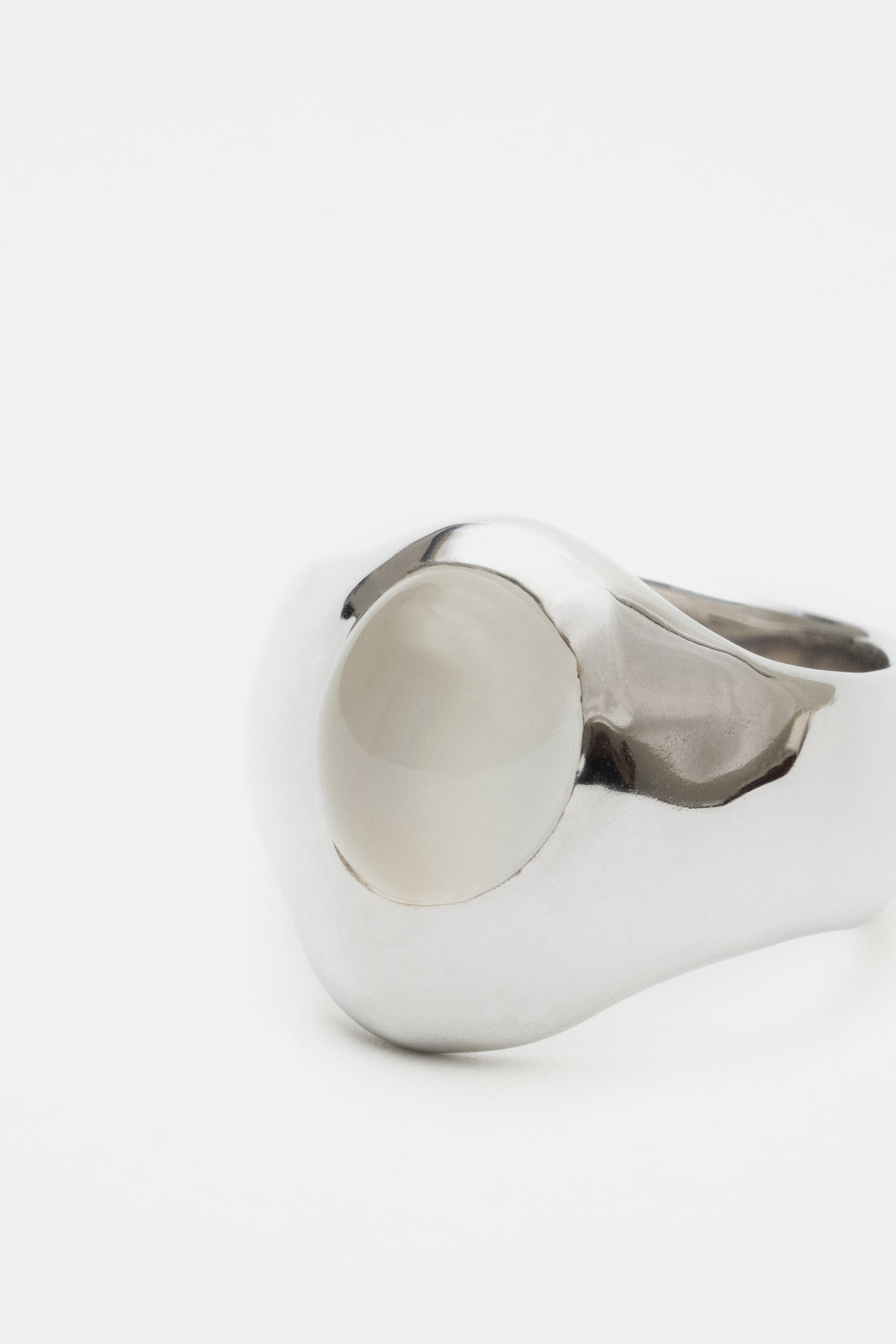 有機的な丸い形は太陽を意味しており、使用しているムーンストーンに映る光(シラー)からは日差しや入日、日の出を連想させます。