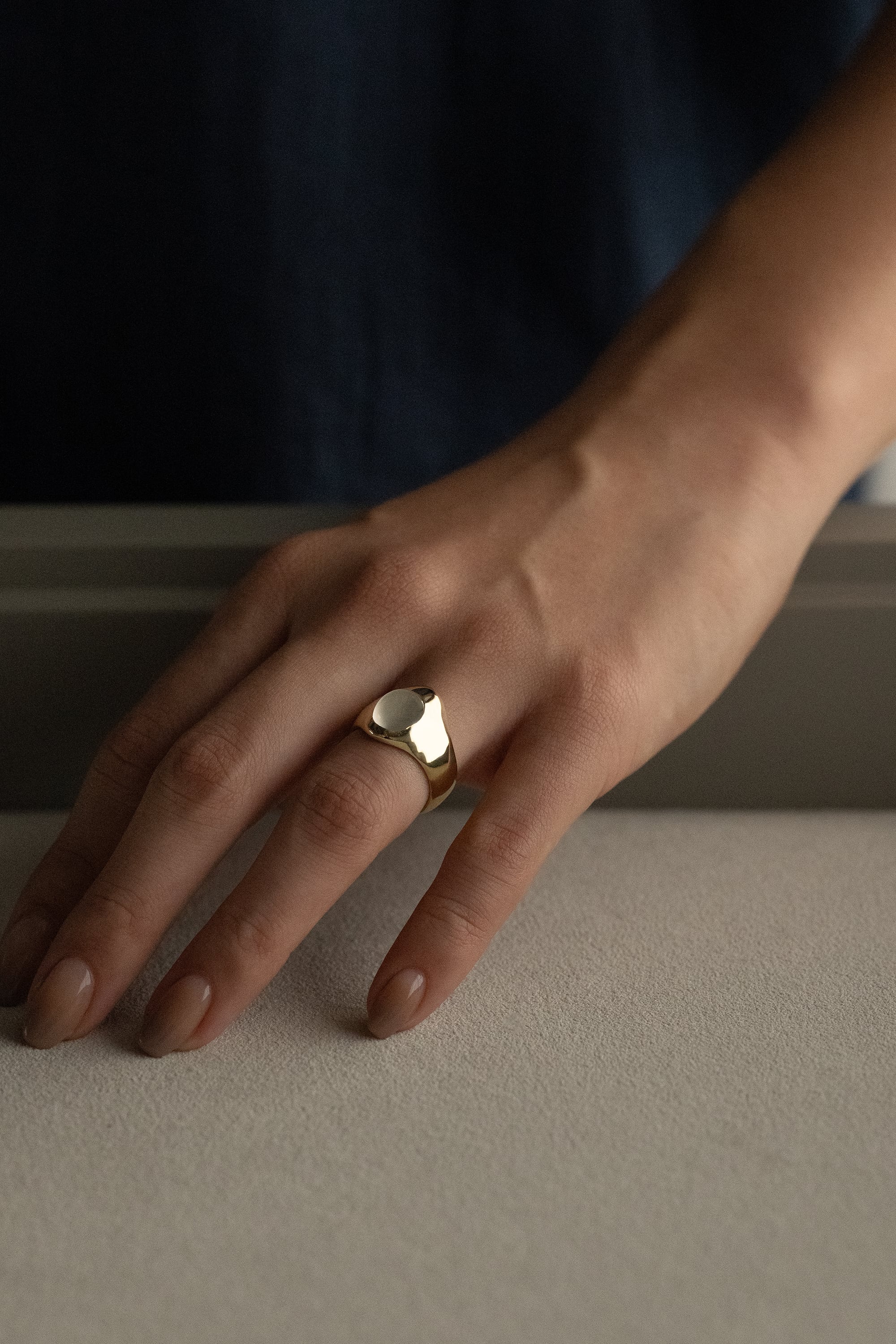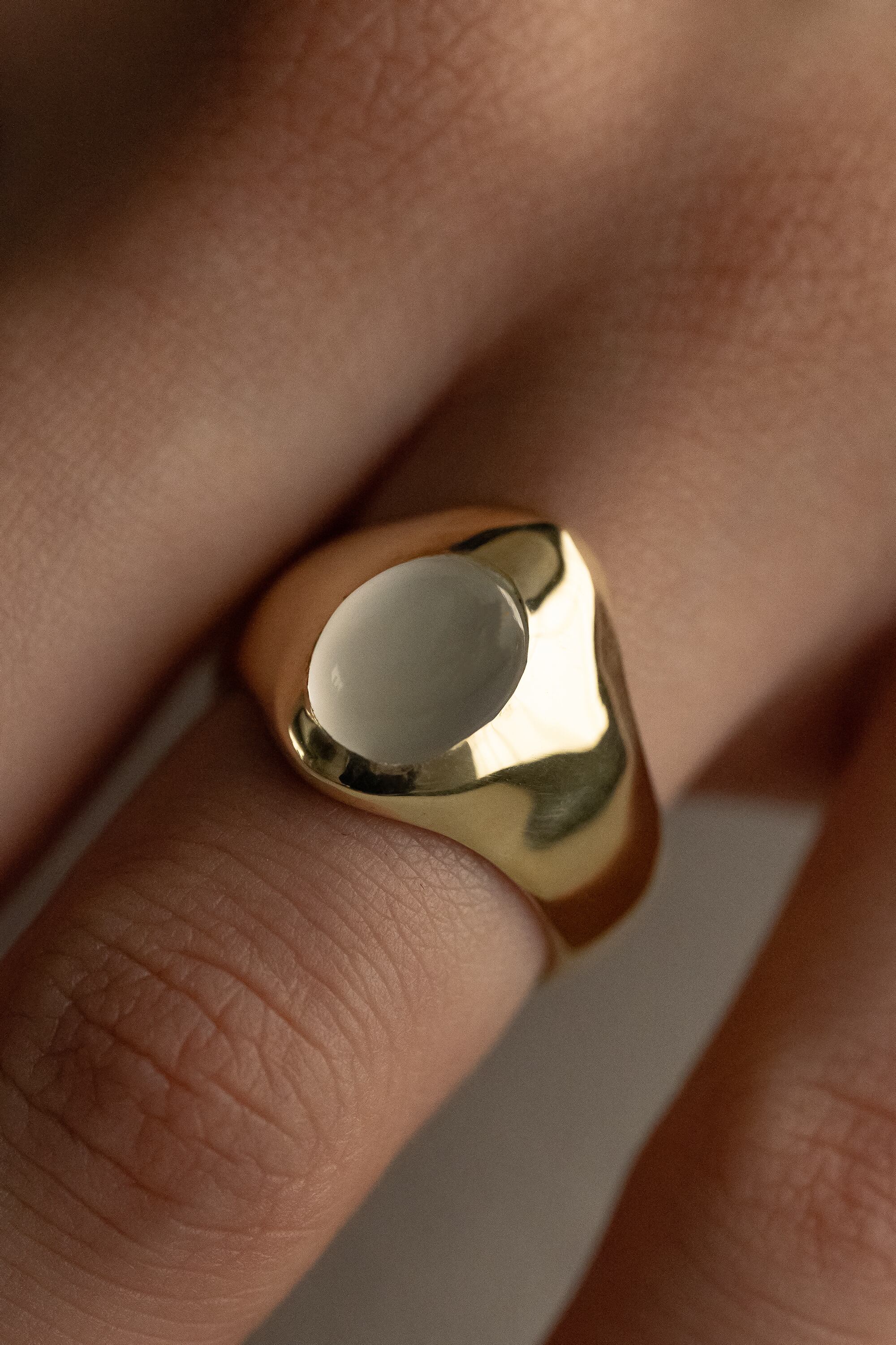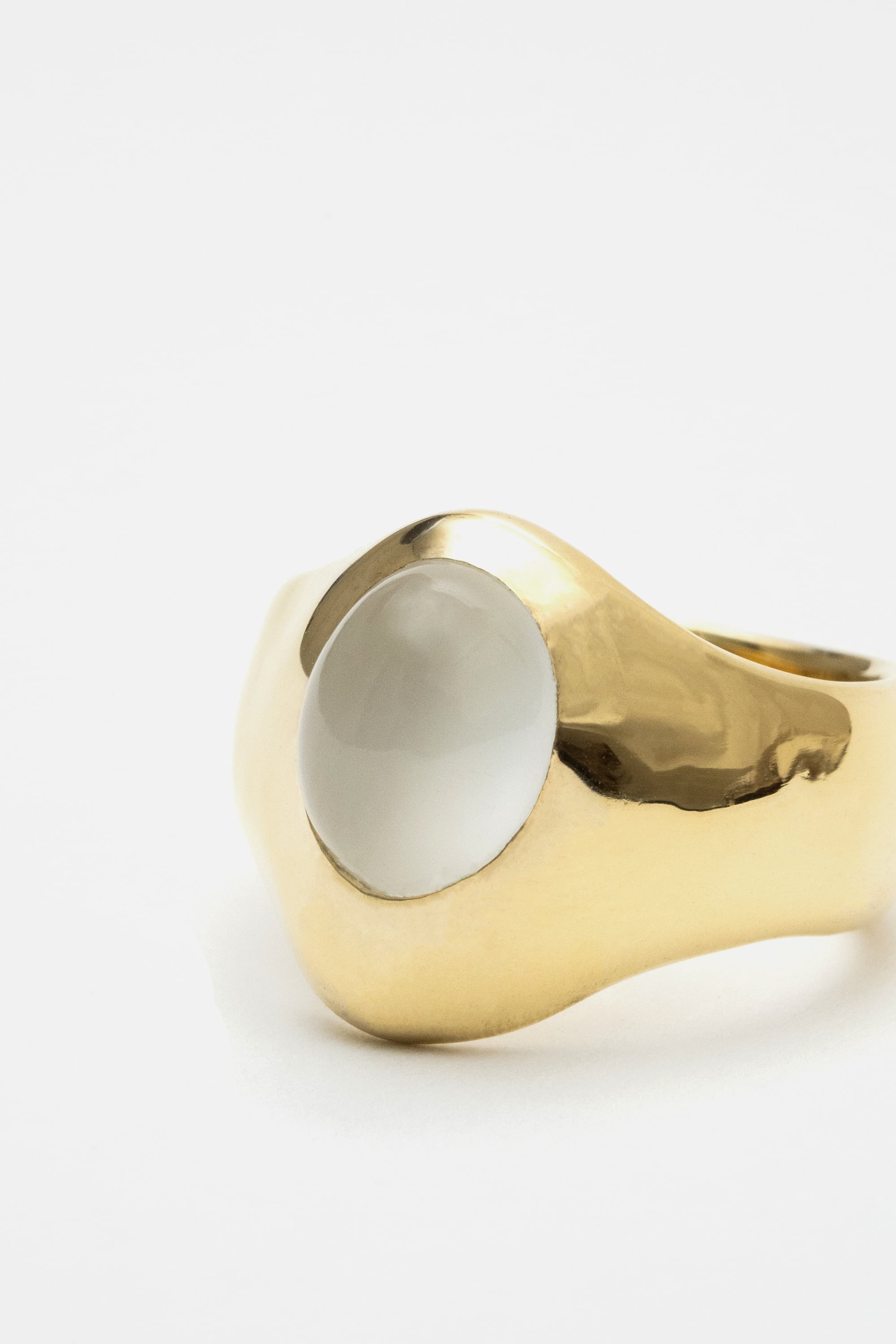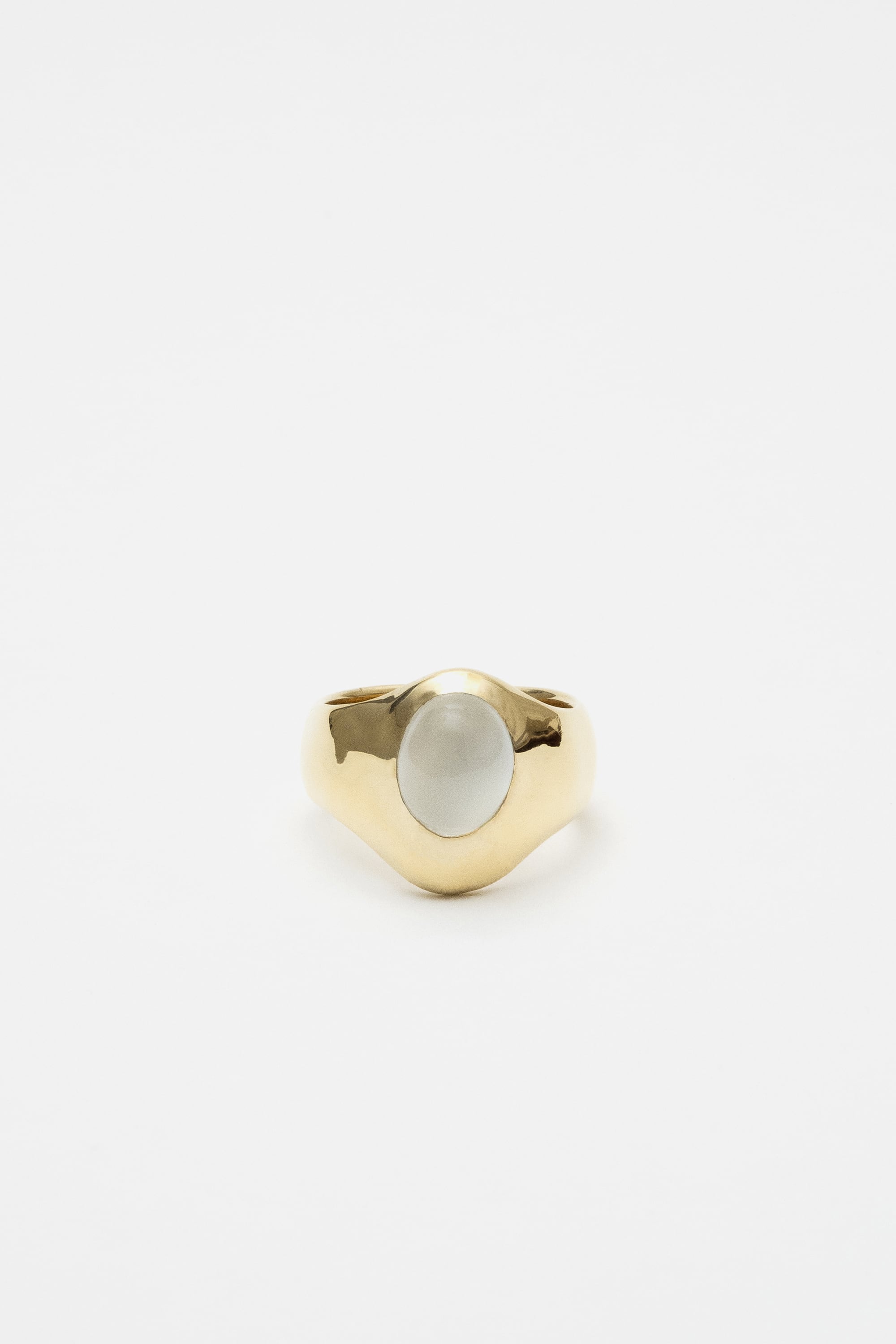 有機的な丸い形は太陽を意味しており、使用しているムーンストーンに映る光(シラー)からは日差しや入日、日の出を連想させます。