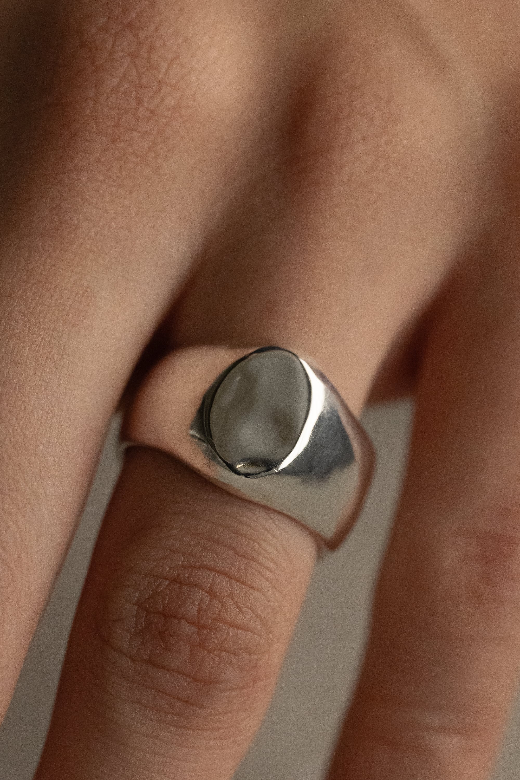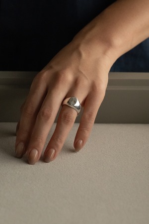 水面の揺らぎを表現するために畝りのある形を残しており、水面の光と同じように優しく反射します。また、角に丸みを持たせることで有機的な動きのあるデザインに仕上げており、性別問わず着用しやすい程よい厚みと幅があります。着用時は細かな傷や、コーティングが薄くなっていく姿も美しく、重厚感のあるリングです。