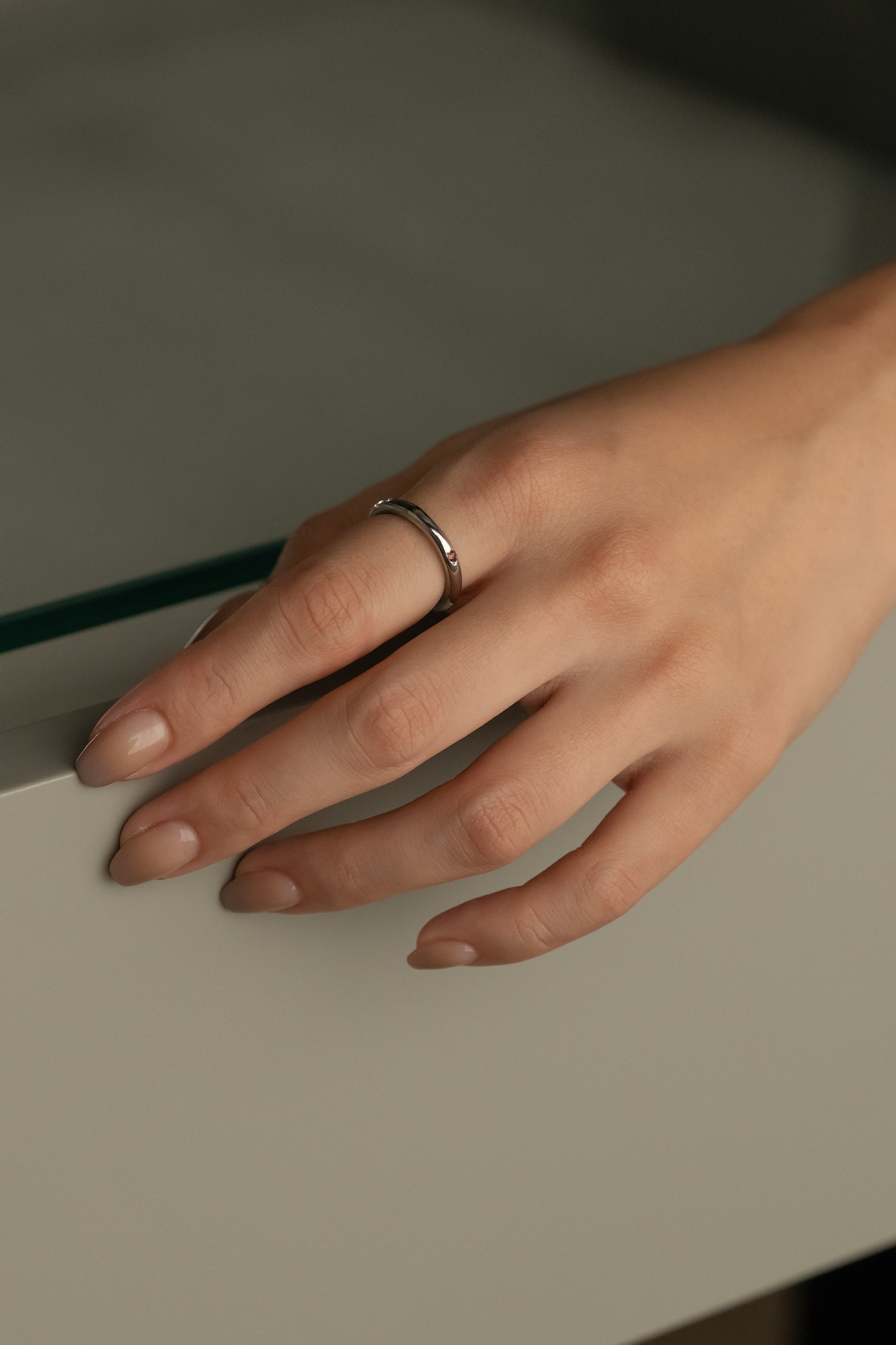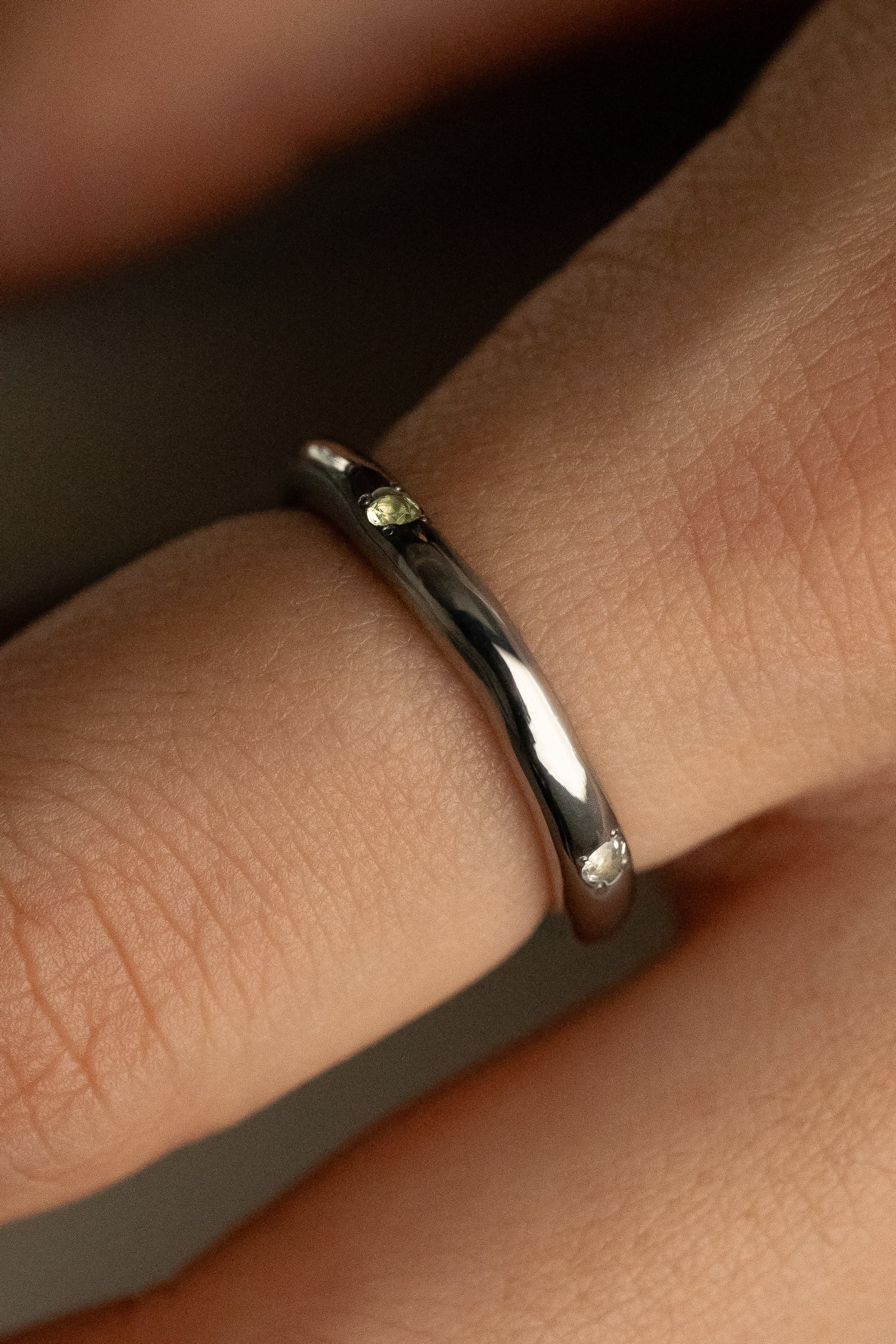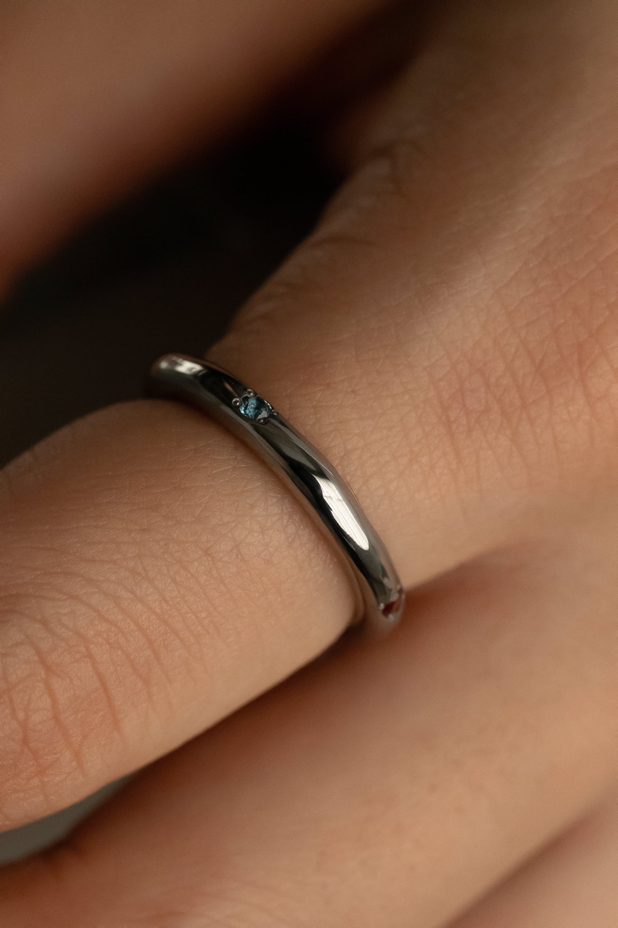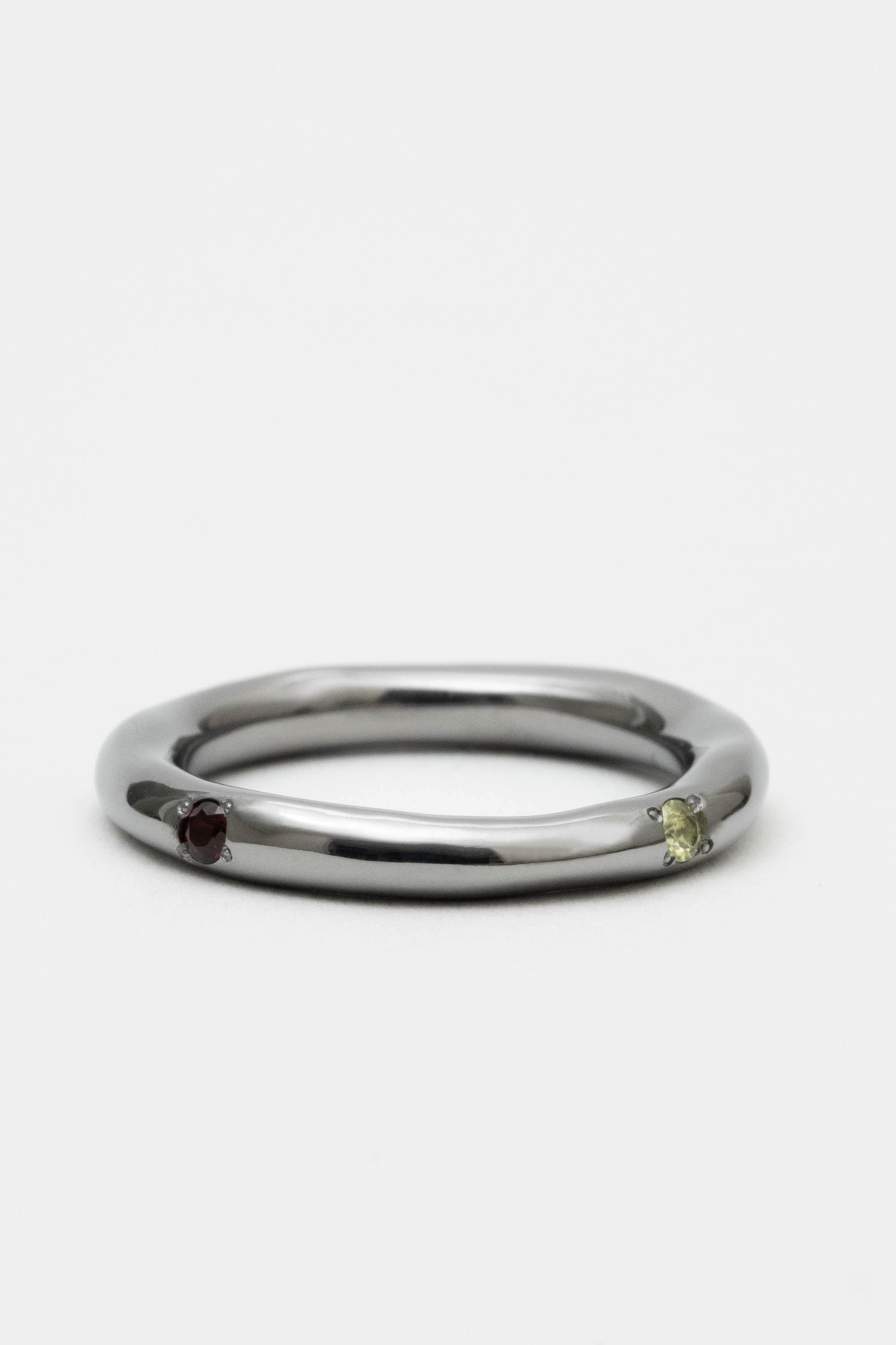 太陽や月の周囲に薄い雲がかかった際に見られる光の輪が現れる現象(HALO)を表現したリングです。光の三原色である、赤(ガーネット)緑(ペリドット)青(ロンドンブルートパーズ)そして光のカラーとして、(ホワイトトパーズ)を等間隔に留めています。どの面を正面にしても良く、飽きの来ないシンプルなリングです。