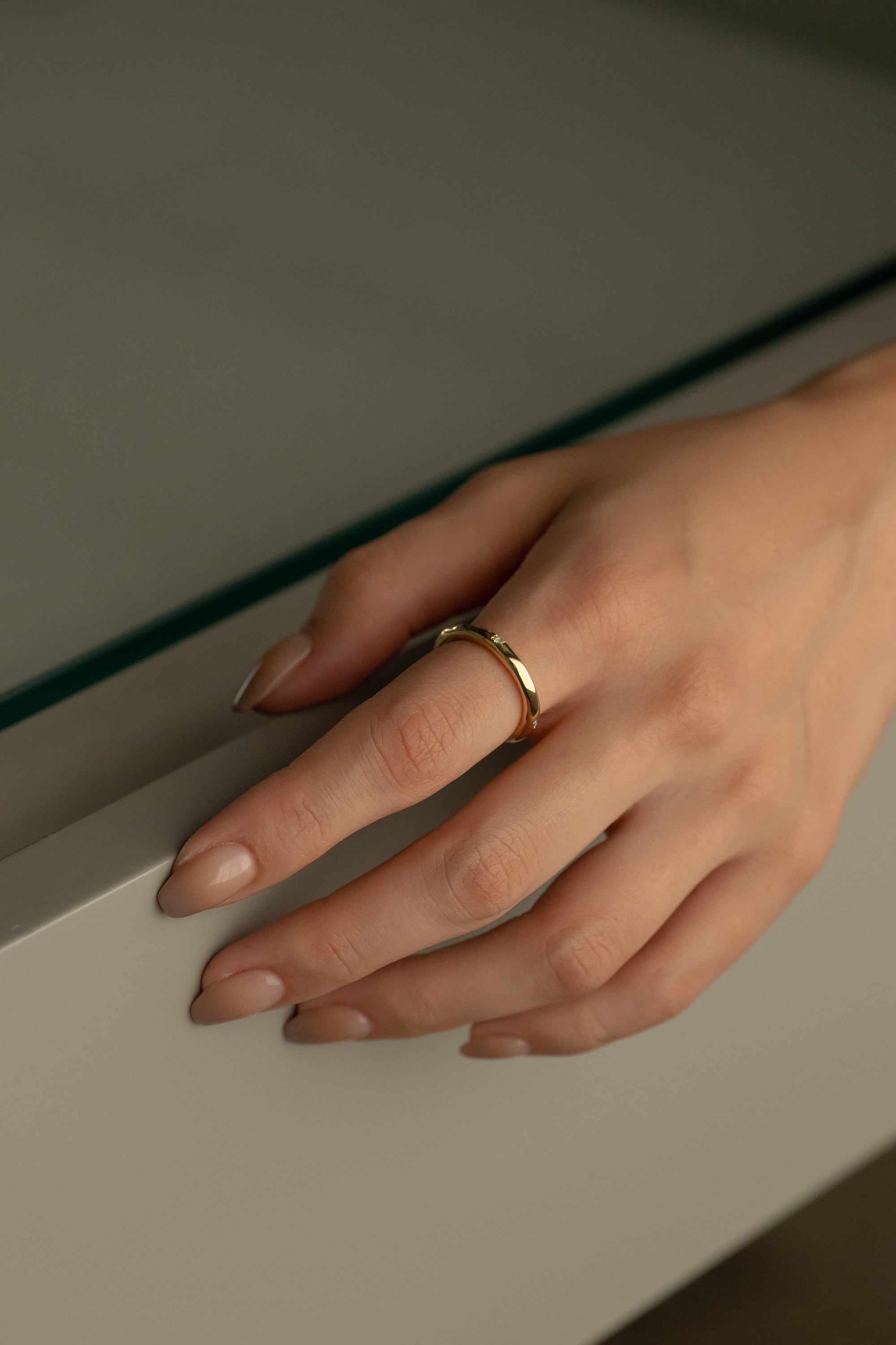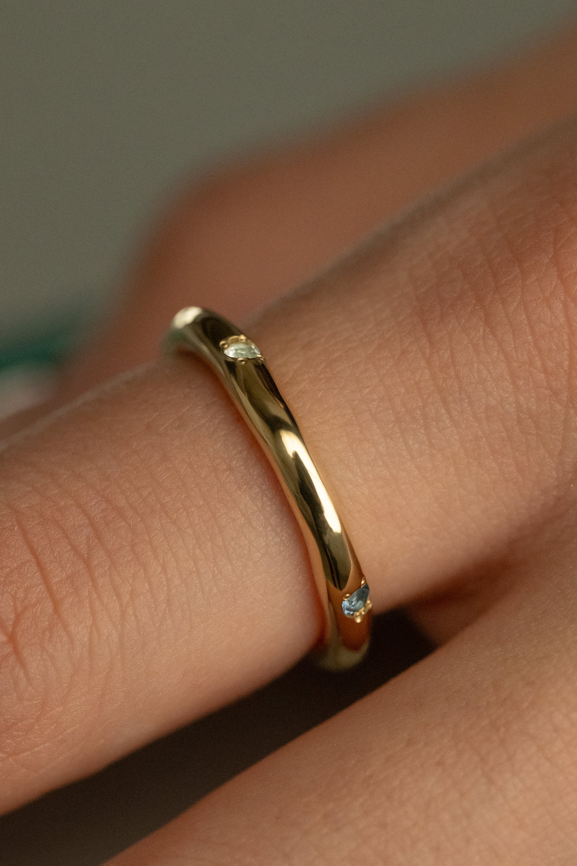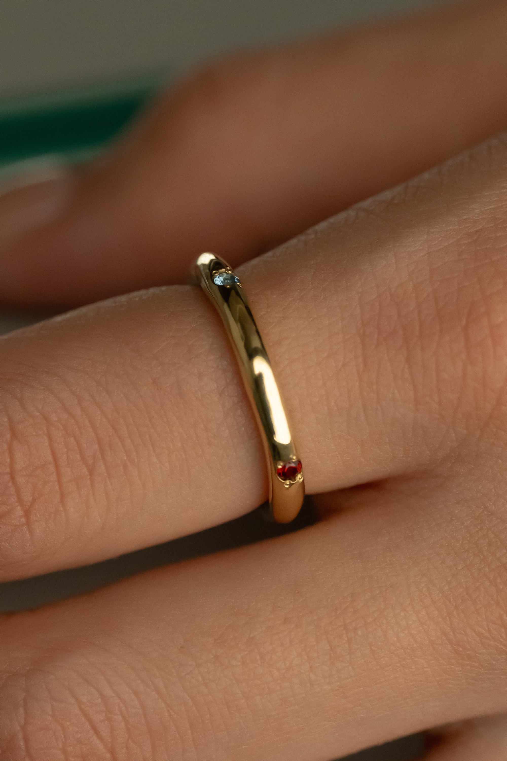太陽や月の周囲に薄い雲がかかった際に見られる光の輪が現れる現象(HALO)を表現したリングです。光の三原色である、赤(ガーネット)緑(ペリドット)青(ロンドンブルートパーズ)そして光のカラーとして、(ホワイトトパーズ)を等間隔に留めています。どの面を正面にしても良く、飽きの来ないシンプルなリングです。