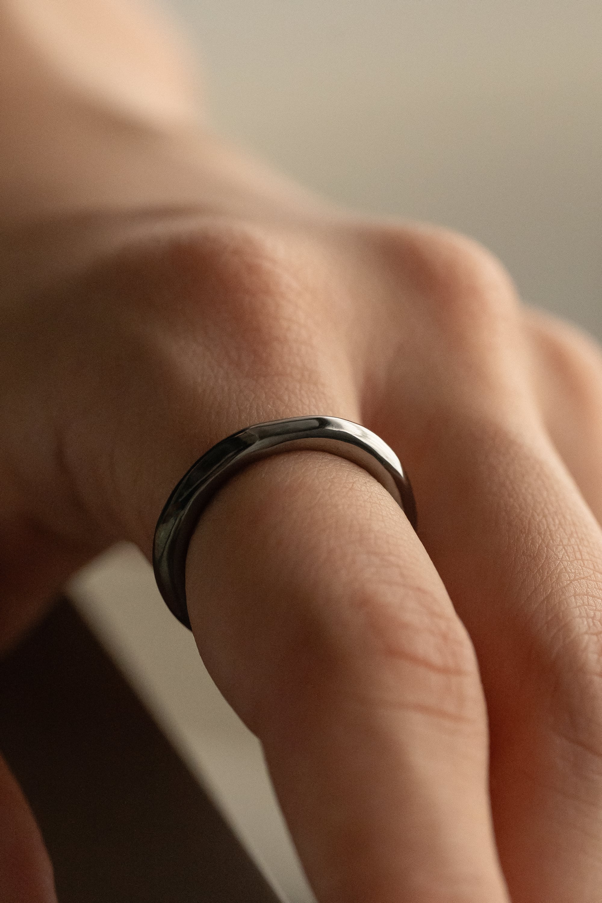 太陽や月の周囲に薄い雲がかかった際に見られる、光の輪が現れる現象(HALO)を表現したリングです。ほんの少しだけ揺らぎのある形は、どの面を正面にしても良く飽きの来ないシンプルなリングです。光の輪の内側と外側で明暗が違うことから、ブラックロジウムとゴールドの2色展開にしています。