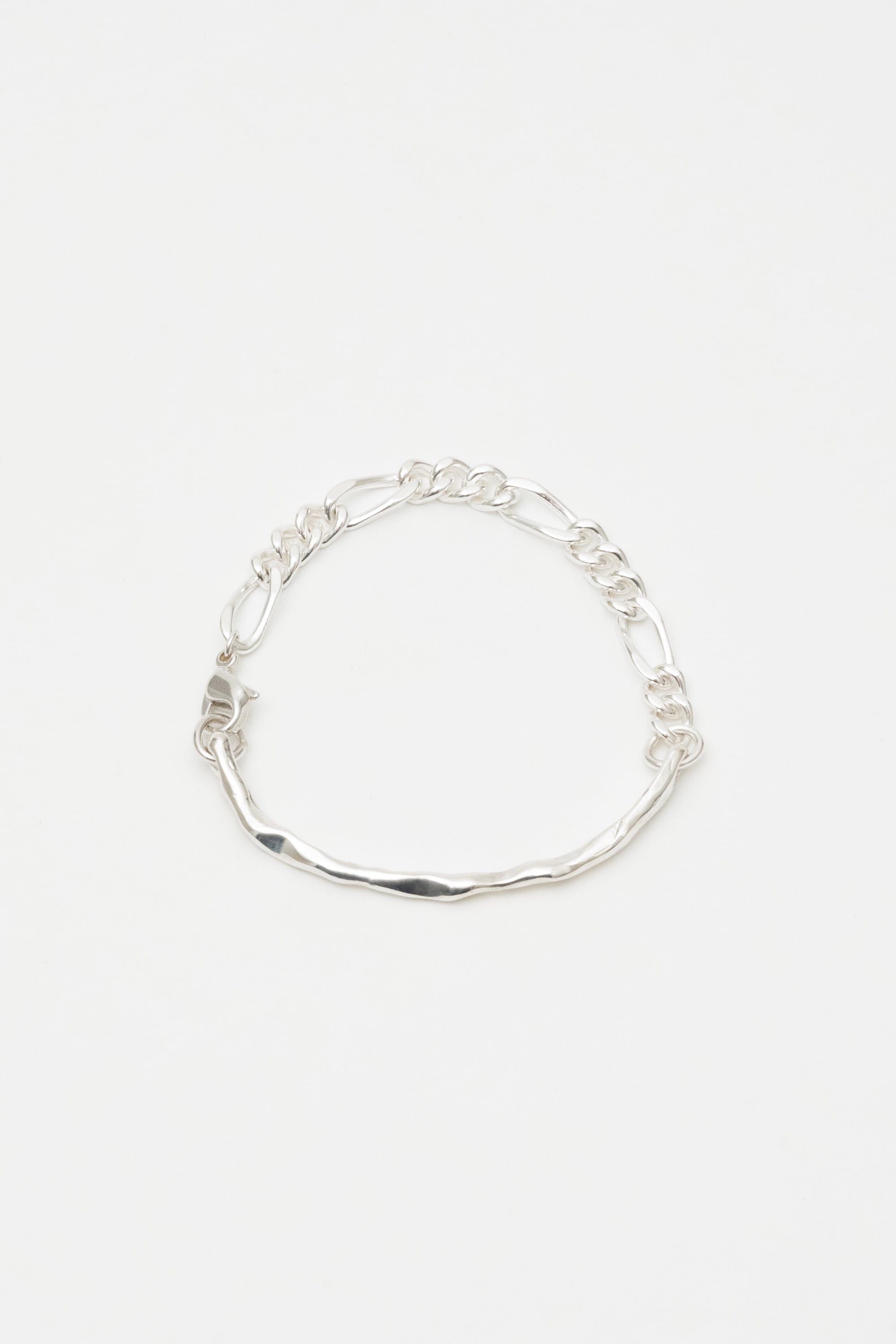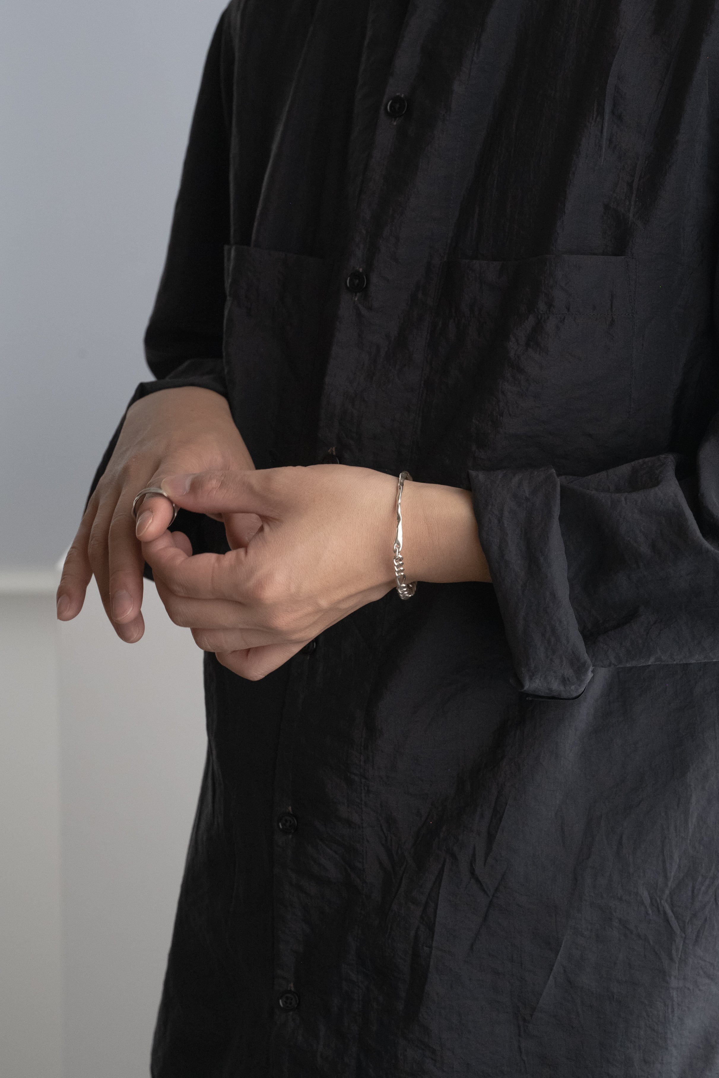 太陽から届く白色光線という光の現象をイメージソースに、揺らぎや乱反射する美しい光の動きを形にしたブレスレットです。動きのあるチェーンは光の波長を意味しており、揺らぎのある形をしたシルバーパーツに光が反射し、美しく輝きます。